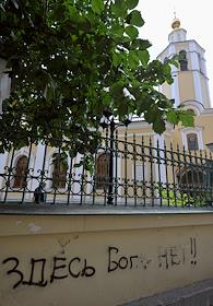 Жанровая съемка. Надписи на заборе православного храма у станции метро "Сокол".