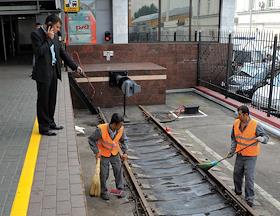 Рабочие убирают мусор на железнодорожных путях Ленинградского вокзала перед посещением мэра Москвы…