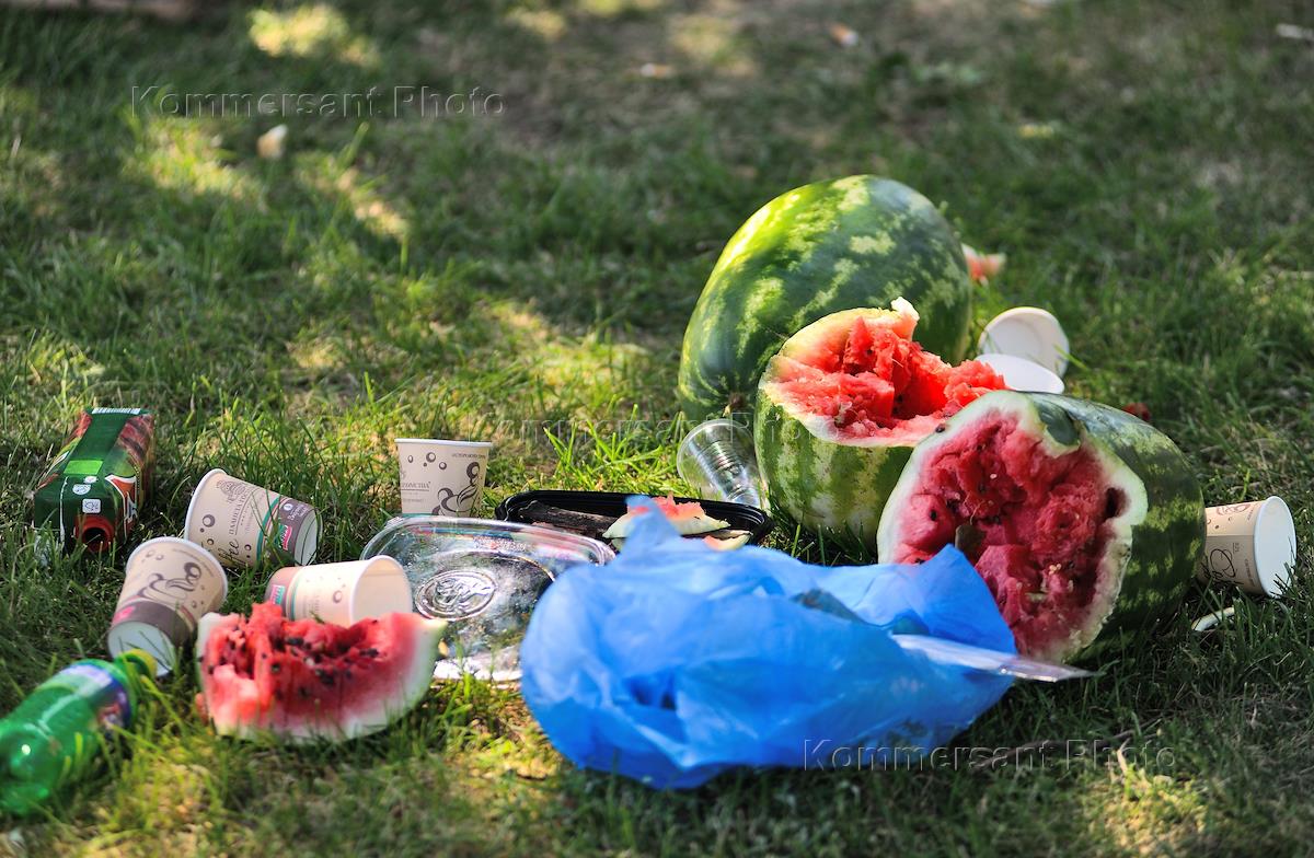 Жанровая фотография. Остатки еды, арбуза, мусора на траве после празднования Дня Воздушно-десантных…