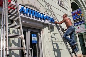 Жанровая фотография. Рабочий на лестнице устанавливает новую вывеску на здание аптеки №313.