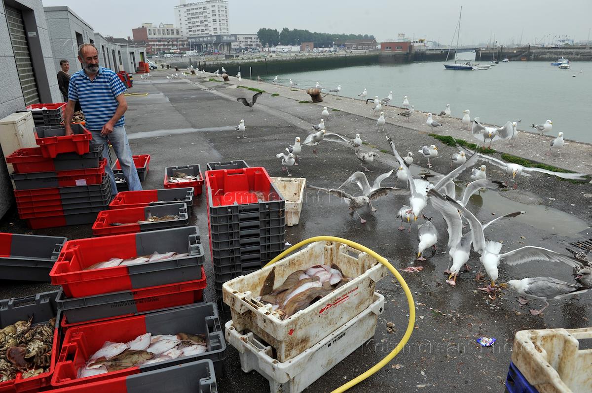 Виды порта Кале. Чайки у ящиков с пойманой рыбой.