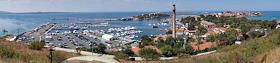Жанровая фотография. Виды города Созополь. Мужчина на качелях на детской площадке.