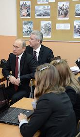 День знаний. Президент России Владимир Путин (справа) во время посещения московской гимназии №1519.