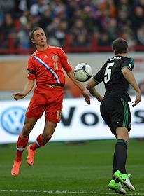 Чемпионат мира-2014 по футболу. Отборочный турнир. Футболист Алан Дзагоев (слева) во врем матча…