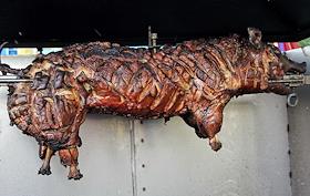 Сельскохозяйственная ярмарка на Ярославовом дворище. Жареный поросенок на вертеле.