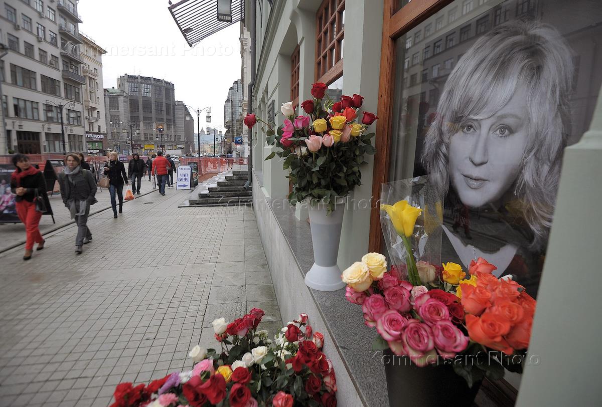 Цветы у портрета на здании Московского художественного театра (МХТ) имени Чехова актрисы Марины…