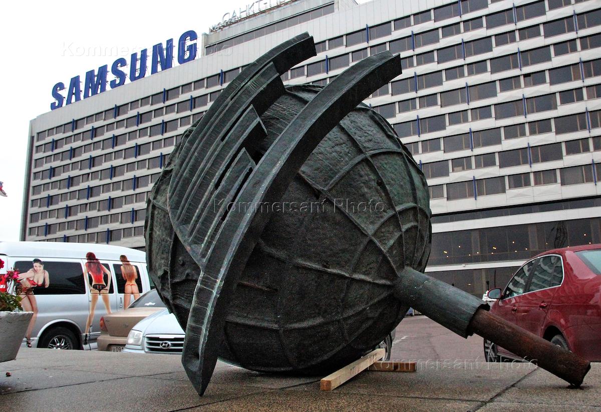 Виды Санкт-Петербурга. Скульптура с эмибемой "Интуриста" на фоне рекламы стриптиз-клуба.