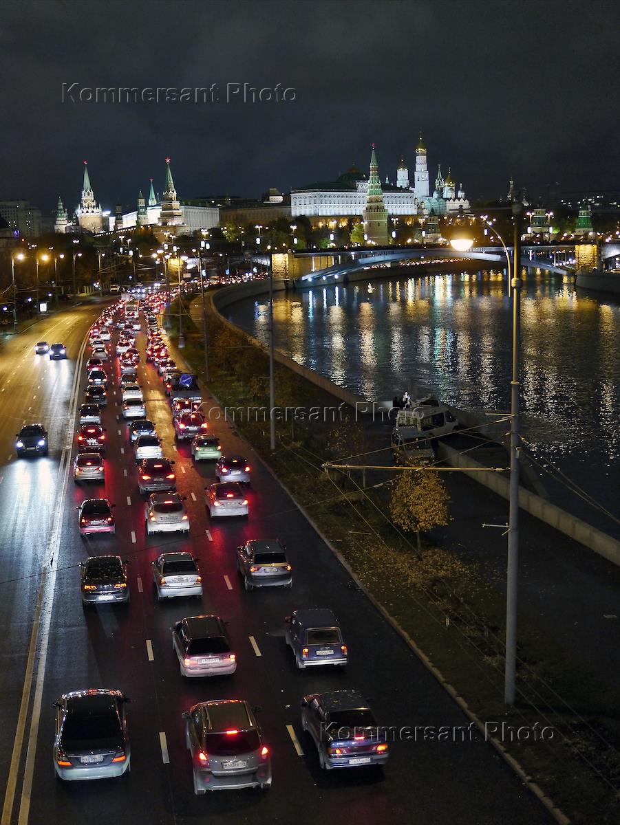 Виды ночной Москвы. Кремль и автомобильная пробка на Пречистенской набережной.