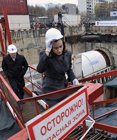 Рабочие во время запуска проходческого щита на строительстве станции метро "Тропарево"…