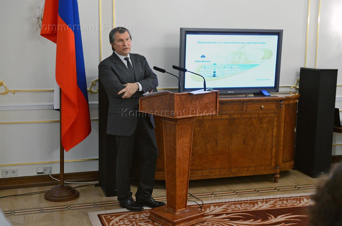 Президент, председатель правления "Роснефть" Игорь Сечин (справа) во время встречи президента…