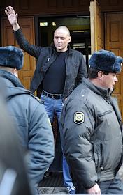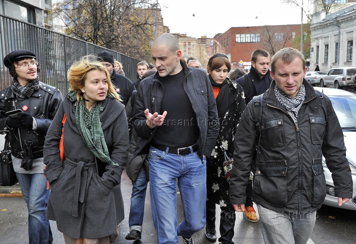 Лидер движения "Левый фронт" Сергей Удальцов (в центре) после допроса в Следсвтенном комитете.