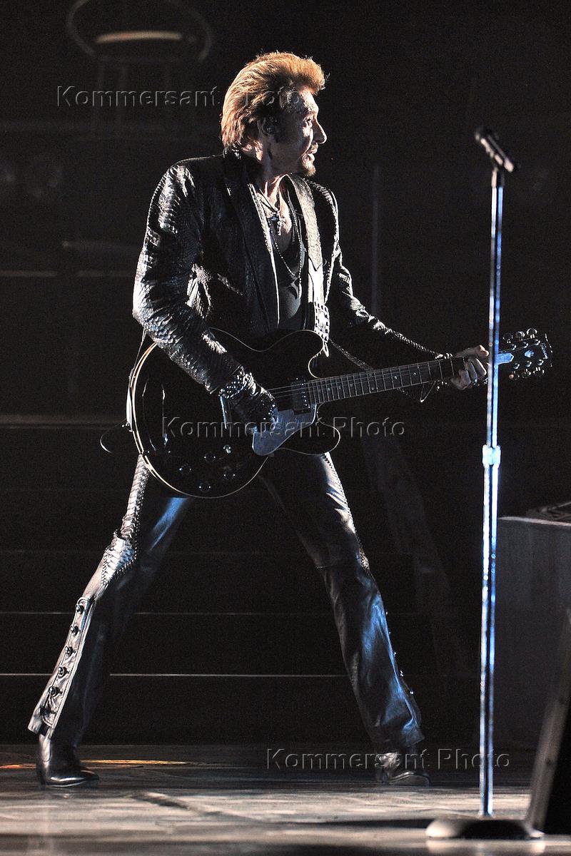 Французский певец и актер Джонни Холлидей во время выступления на концерте в Государственном…