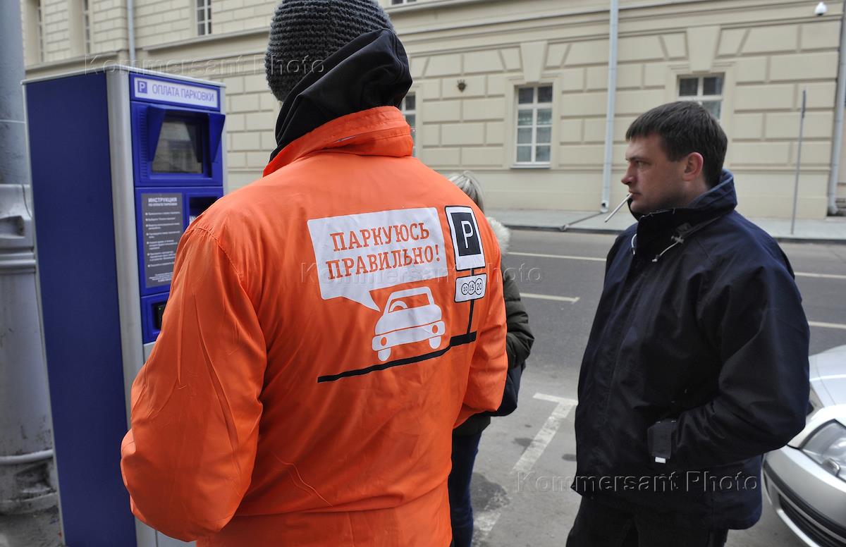 Организация платных парковок в Москве. Служащий парковки помогает водителю автомобиля оплатить…