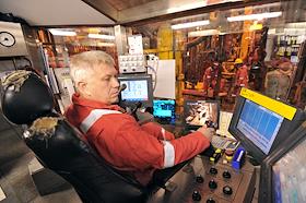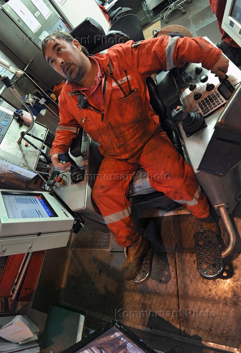 Буровая газодобывающей платформы "Лунская-А". Оператор буровой во время работы.
