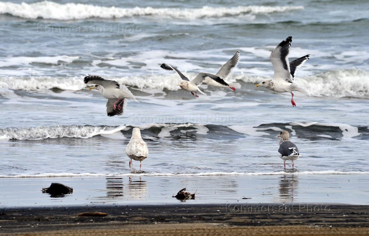 Виды северного побережья острова Сахалин близ поселка Стародубское. Охотское море. Чайки на берегу.