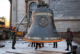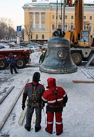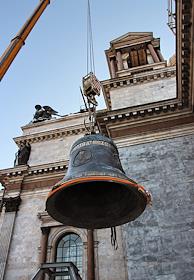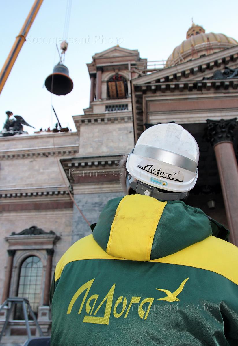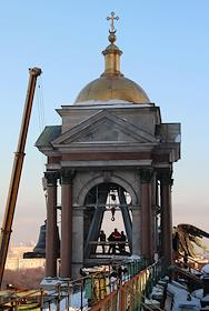 Подъем на звонницу Исаакиевского собора 10-тонного полиелейного колокола, отлитого в Воронеже.