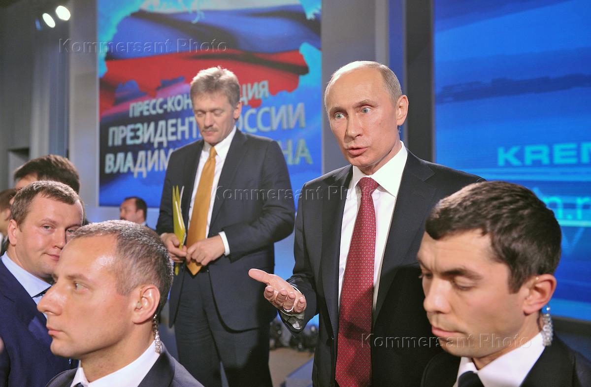 Пресс-секретарь президента России Дмитрий Песков (слева) во время большой ежегодной…