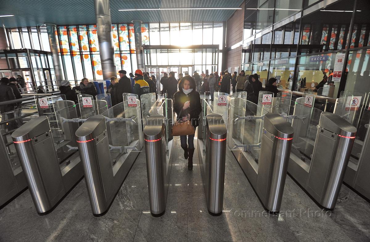 Церемония открытия станции метро "Алма-Атинская". пассажиры во время прохода через турнике в холле…