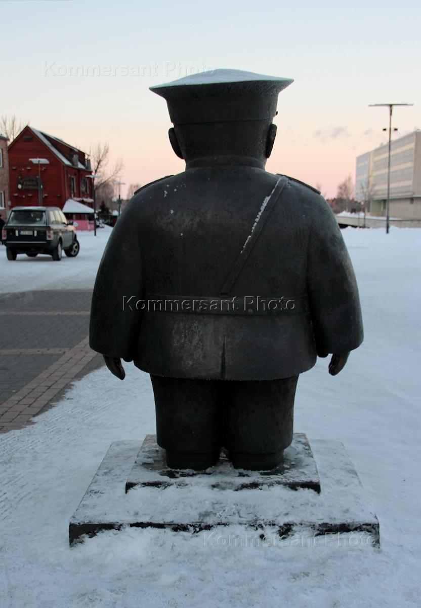 Виды Оулу. Бронзовая статуя рыночного полицейского на торговой площади Кауппатори перед рынком…