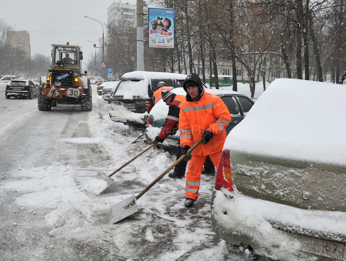 Снегопад в Москве. Сотрудники коммунальной службы чистят снег на улицах города.