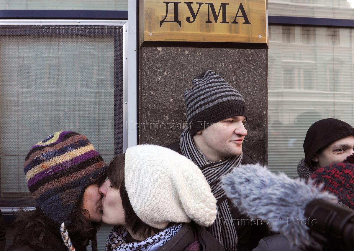 Акция против принятия закона "О запрете пропаганды гомосексуализма" прошла у здания Госдумы.