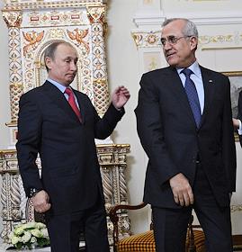 Президент Ливана Мишель Сулейман (слева) и президент России Владимир Путин (справа) во время встречи…