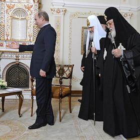 Слева направо: президент России Владимир Путин, патриарх Московский и всея Руси Кирилл,…