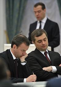 Президент России Владимир Путин (справа) и председатель правительства России Дмитрий Медведев…