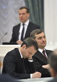 Председатель правительства России Дмитрий Медведев (в центре) и президент России Владимир Путин…