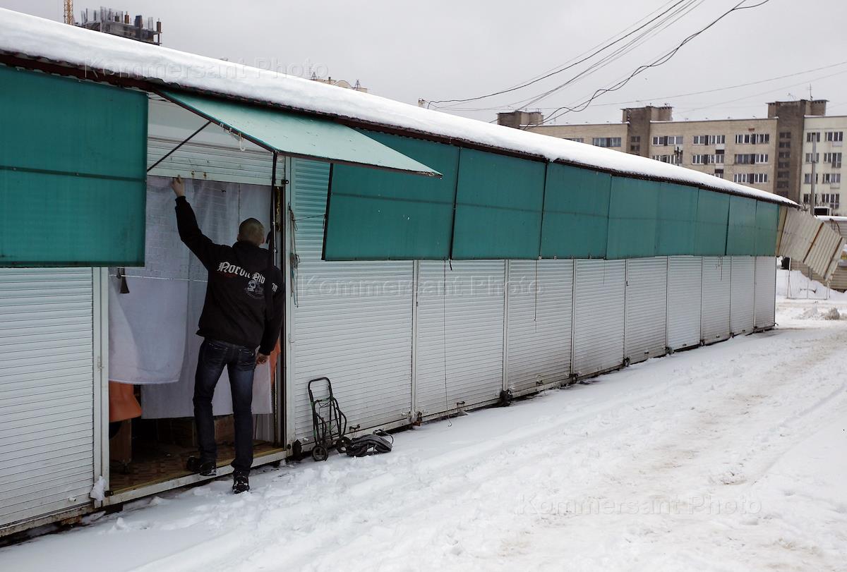 Вещевой рынок города. Продавец закрывает свой торговый павильон.
