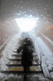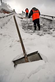 Последствия сильного снегопада в Москве. Сотрудники коммунальной службы чистят снег на лестнице.