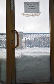 Последствия сильного снегопада в Москве. Сугробы снега за оконным стеклом.