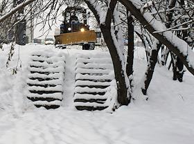 Последствия снегопада в Москве. Снегоуборочная техника во время расчистки пешеходных дорожек.