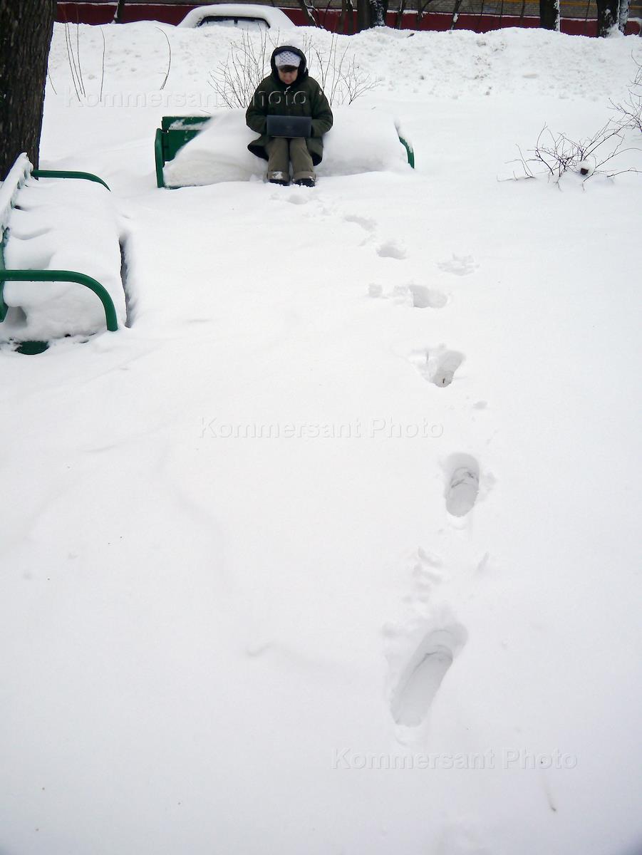Последствия снегопада в Москве. Женщина с ноутбуком на заснеженной скамье в парке.