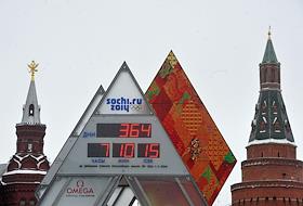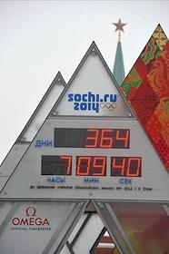 Олимпийские часы обратного отсчета времени до церемонии отурытия Олимпиады-2014 в Сочи на Манежной…