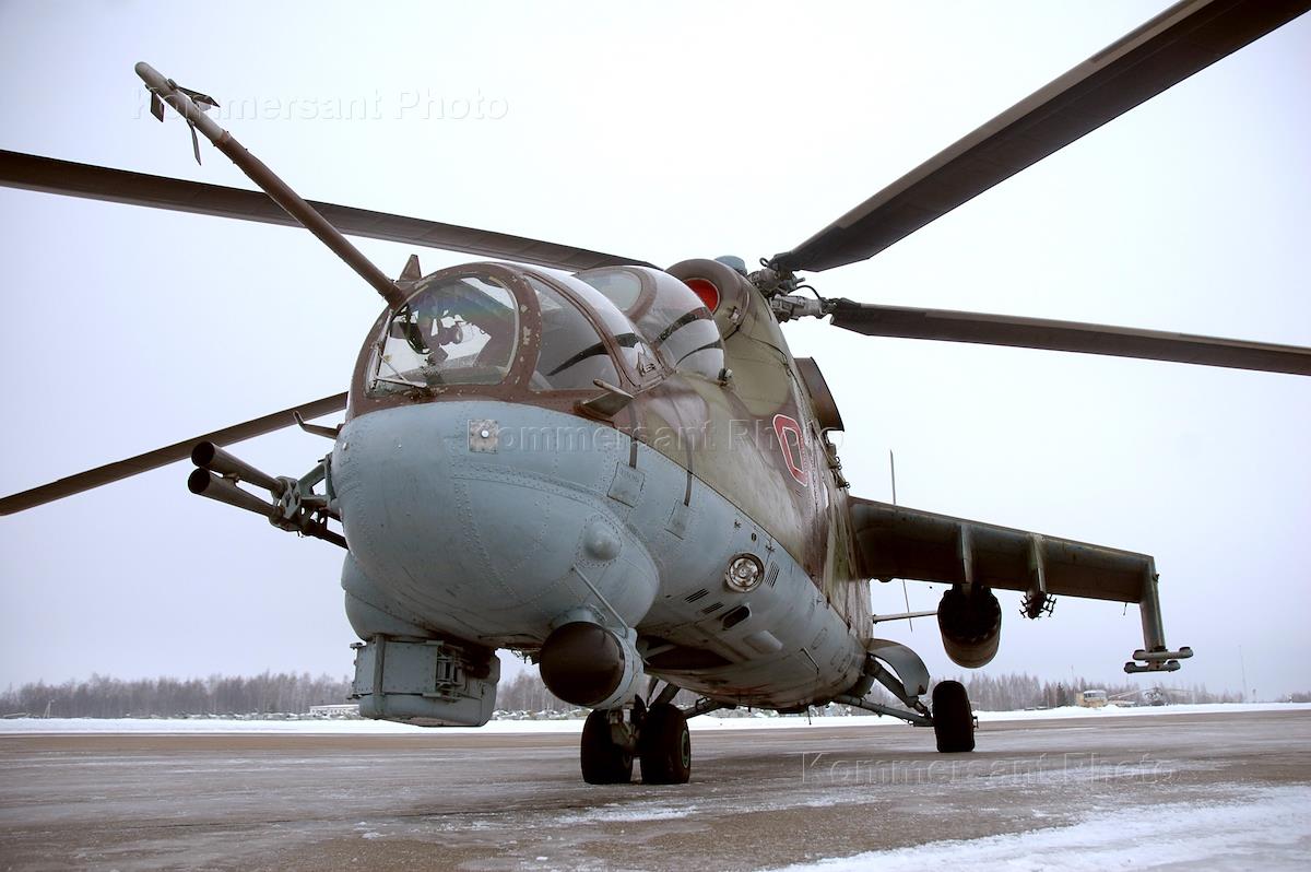 Авиабаза армейской авиации "Вязьма". Вертолет Ми-24П на взлетной полосе.