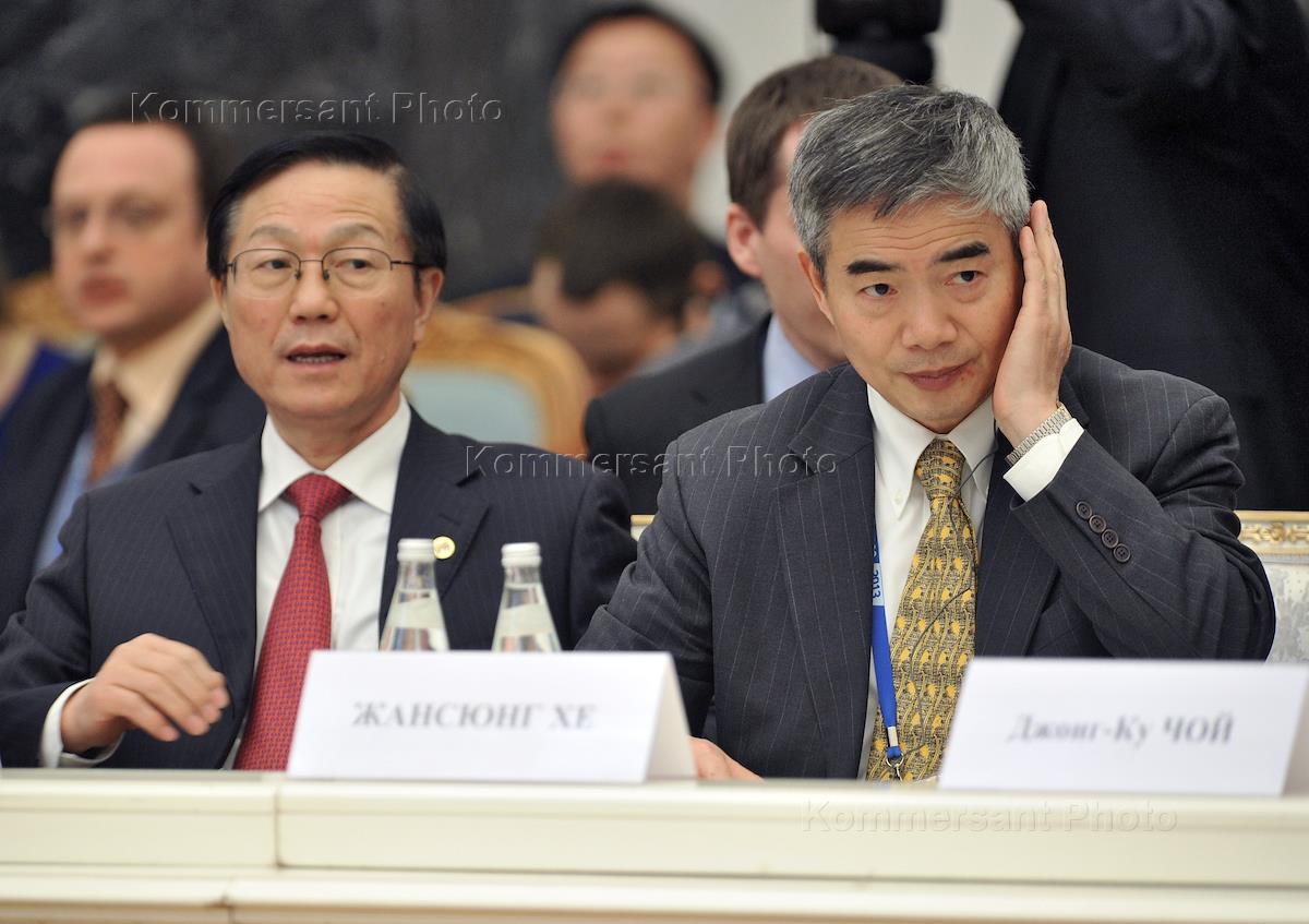 Министр финансов КНР Се Сюйжэнь (слева) во время встречи с участниками первой встречи министров…
