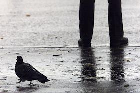 Ноги мужчины и голубь на мокром асфальте на улице Мельникова.