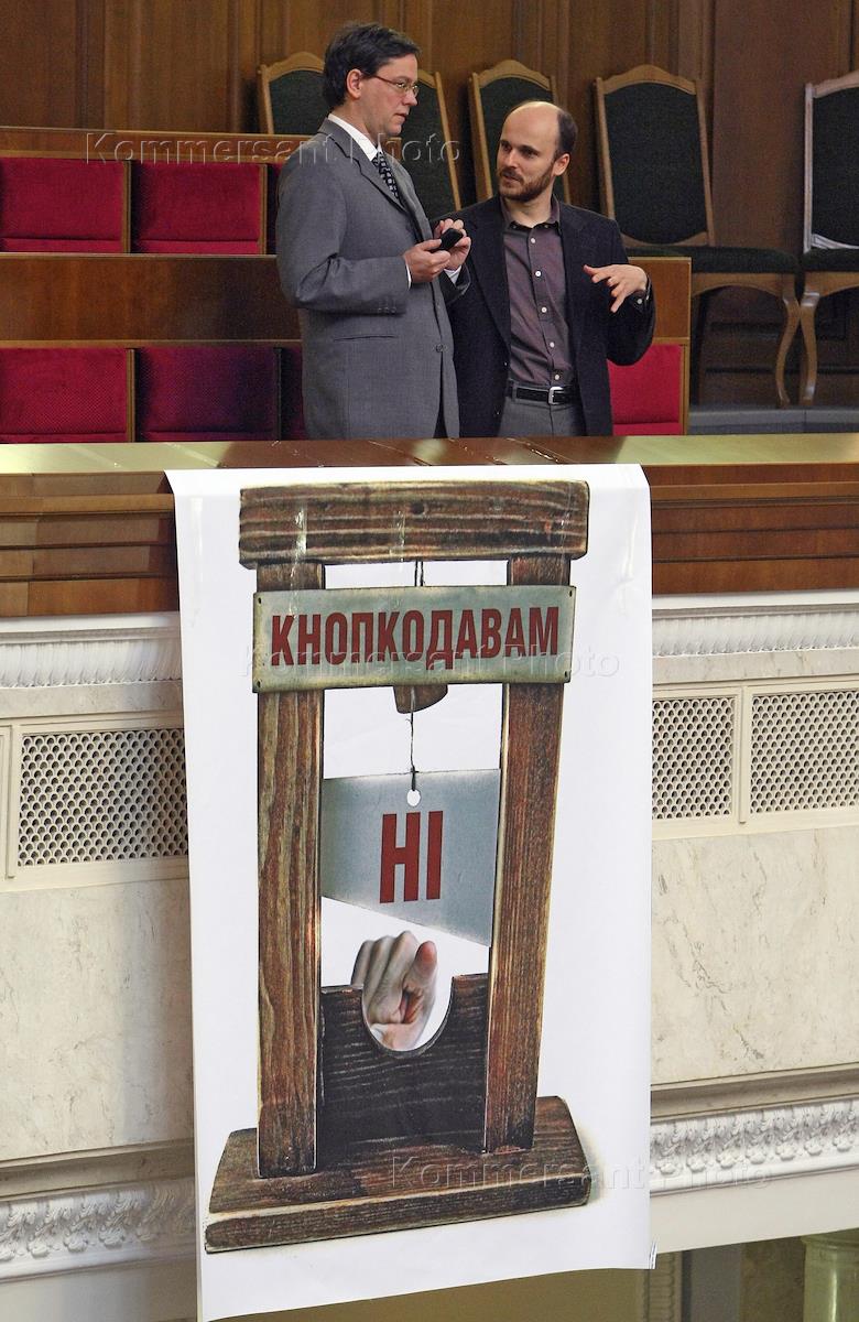 Заседание Верховной рады Украины. Разблокирование президиума парламента. Плакат с надписью…