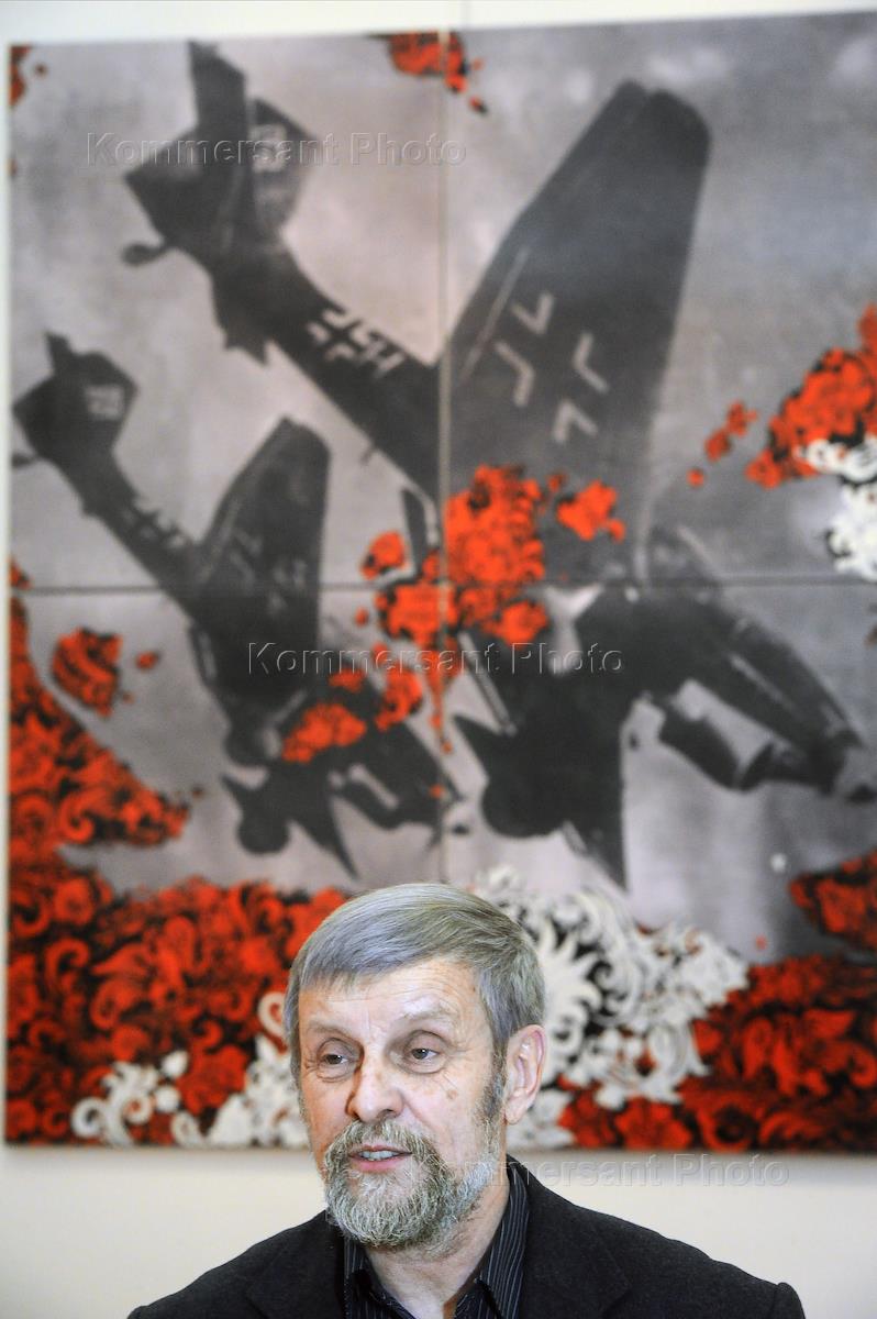 Художник Борис Орлов у работы "Самолет" на пресс-показе своей выставки "Фантомные боли" в…
