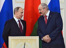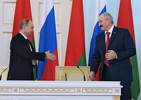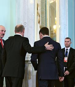 Президент России Владимир Путин (слева), президент Белоруссии Александр Лукашенко (справа) и…