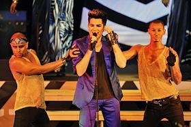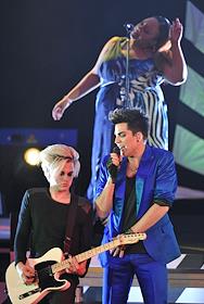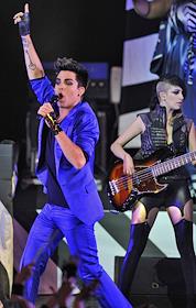 Американский певец Адам Ламберт (в центре) во время выступления на своем сольном концерте в…