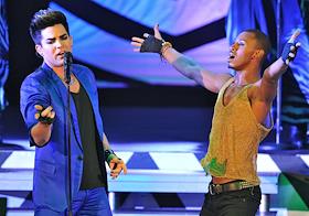 Американский певец Адам Ламберт (справа) во время выступления на своем сольном концерте в концертном…