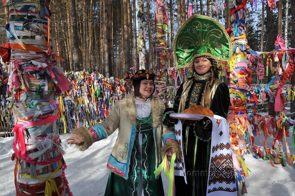 Мемориал, обозначающий границу Европы и Азии. Костюмированное представление для туристов. Девушки в…