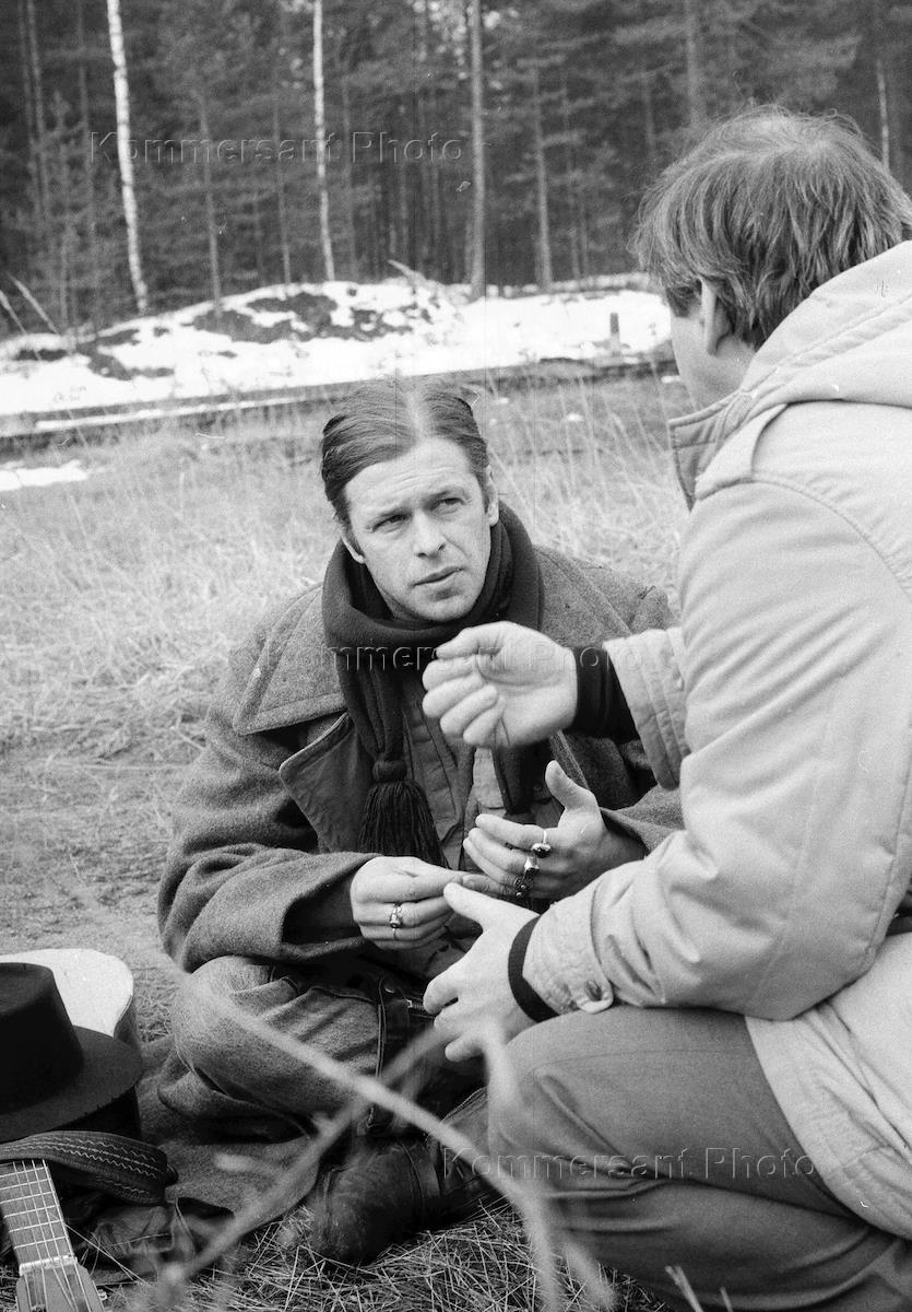 Лидер группы "Аквариум" Борис Гребенщиков (справа) во время съемки клипа "Поезд в огне" (песня…