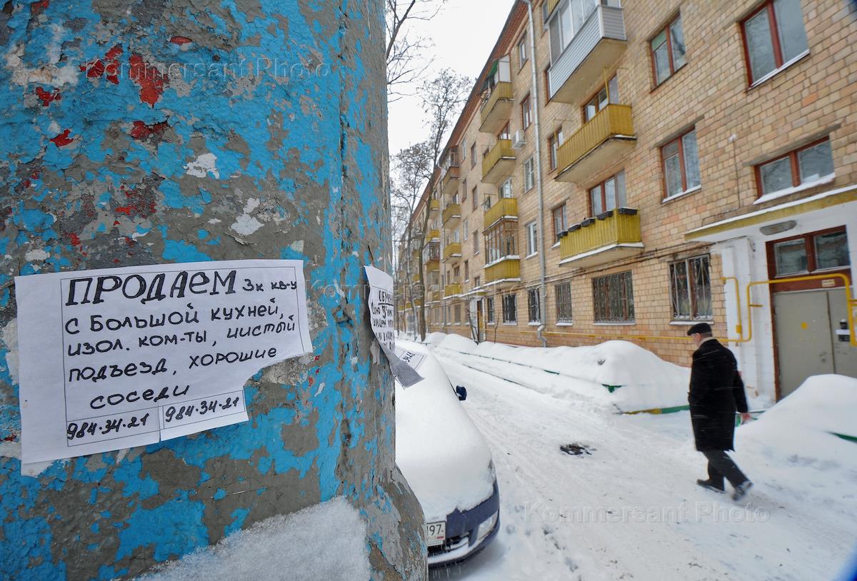 Виды Москвы. Жилые дома в районе Измайлово. На столбе объявлдение о продаже квартиры.