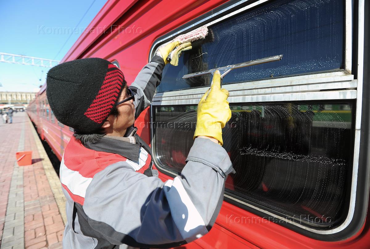 Рабочий во время мойки стекла аэроэкспресса на Павелецком вокзале.