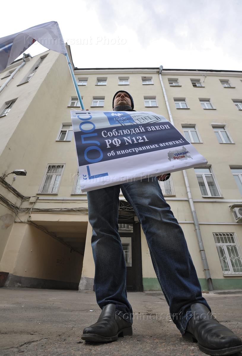 Политика Активисты профсоюза граждан России во время проведения согласованного пикета "Иностранным агентам не место в России". Пикет прошел у центрального офиса ассоциации "Голос".