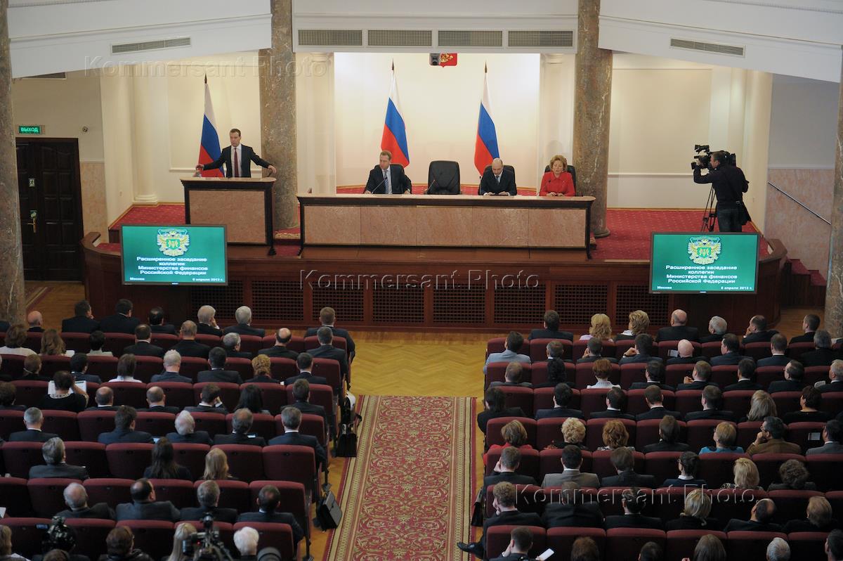 Расширенное заседание коллегии Министерства финансов с участием председателя правительства России Дмитрия Медведева.