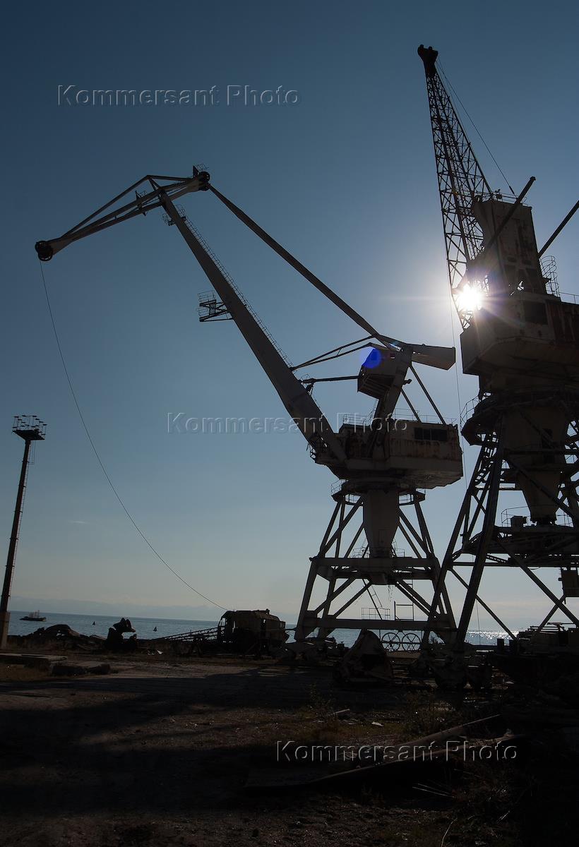 Виды озера Байкал. Подъемный кран на пристани озера.